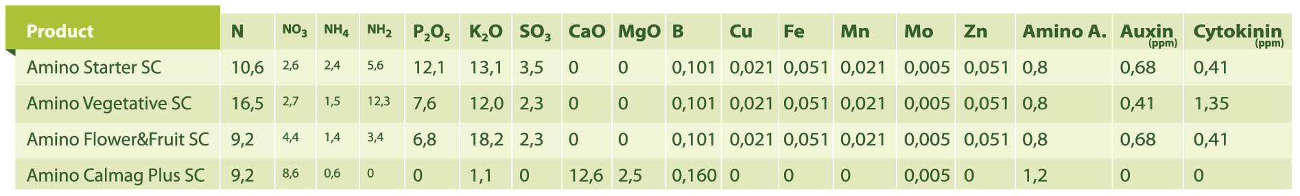 سبيد فول أمينو كالماغ بلاس أس سي عبارة عن سماد سائل القوام مركّز معلّق يحتوي الكالسيوم الماغنزيوم ، تم إضافة الأحماض الأمينية إليه بالإضافة إلى البوتاسيوم و النتروجين و البورون والمولبيد دينيوم أيضاً . إنه منتج مُتمّم لسبيد فول أمينو ستارتر ، لمرحلة التكوين الخضري و التزهير و الإثمار في النبات مع وجود مُغذّيات إضافية في محتوى هذا المنتج . تمّ إنتاج هذا التركيب لدعم و تزويد النبات بالعناصر و المواد المغذّية خلال كافة مراحله الفيزيولوجية الخاصة بدورّته الحياتية وخصوصاً تأمين الكالسيوم و الماغنيسيوم و بنسب متوازنة حسب إحتياجات النبات لذلك .
